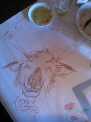 More fun at Macaroni Grill! A quick doodle of yours truly done in crayon. Drawing deer is hard, he wound up looking more like an elk. W/E I'm still learning :3