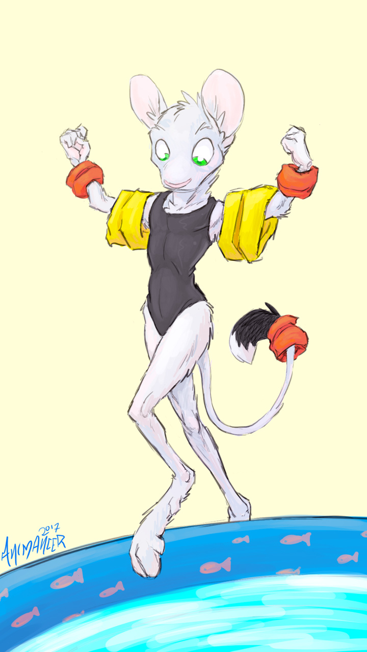 probably needs an swimring around his tummy and a mask and snorkel as well.too cute^^