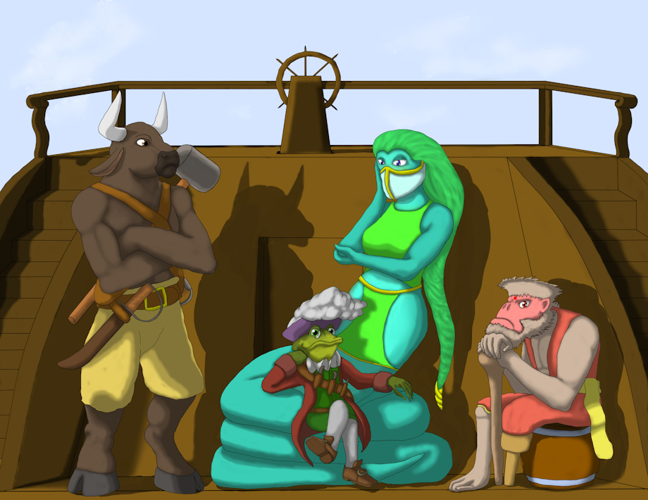 The Bloody Captain Joseph Peelskin and mates. Mister Smite the minotaur, Mura the Lamia and Gutters the Vanara.