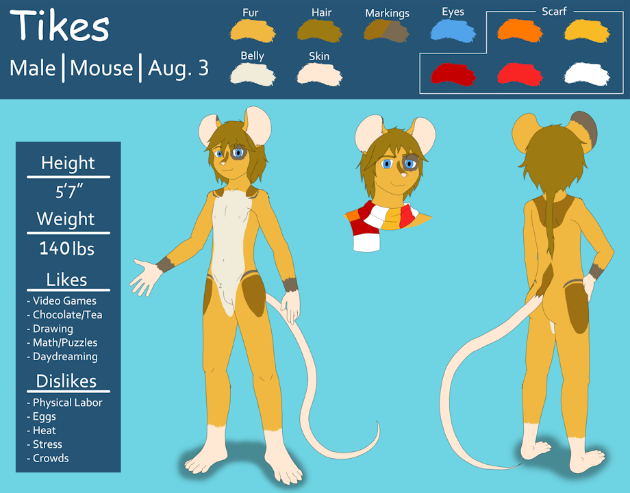 Hiya, I'm Tikes and this is my fursona. I'm a mouse, squeak squeak! I finally took the time to make a reference sheet for my updated fursona. I tried to make myself a bit more unique and less plain looking. I like how it turned out, hopefully you'll agree! =3 NSFW Ver.