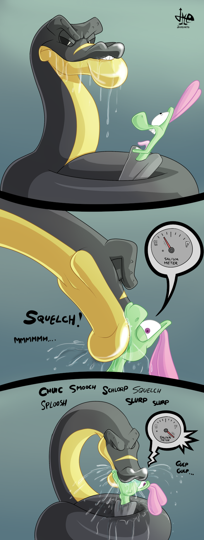 At the zoo Jimmy gets attacked by a giant python with a notable issue with their saliva production as he accidentally falls on them. Due to their developed smell the snake finds an interesting smell in Jimmy's mouth: It was mint, he had some in the way, so they wasted no time and tried to get to the source of the smell and that means sucking his mouth out...