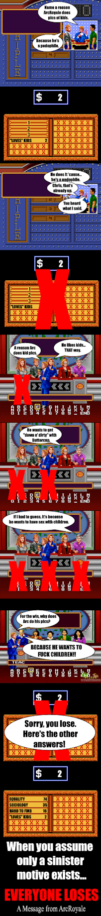 It seems everywhere I go, the only reason I get told I do this stuff is because I'm some kind of pedophile. Even when I say I'm not, they just say I'm "in denial." If I could post my art in places like DeviantArt where it'd be more clear I wasn't one, that'd be one thing. But it's really disconcerting when I say "No I'm not," and get in return "Yes I am." Guilty until proven innocent, and proving innocence is impossible in this kangaroo court, clearly.