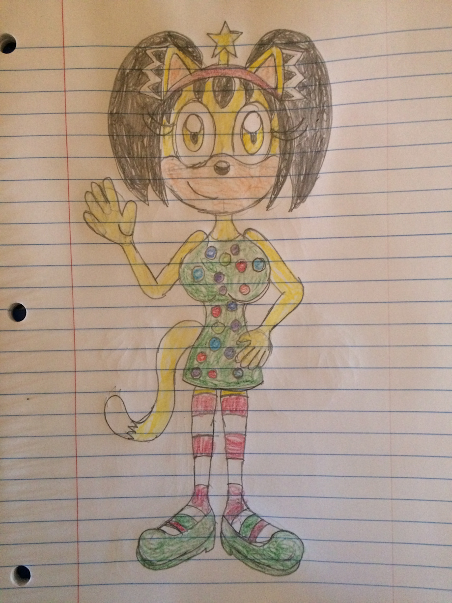 Since it is Christmas time, I decided to draw this; it's Honey the Cat wearing a green dress with colorful circles that resembles a Christmas tree, red and white thigh-high socks that resemble candy canes, and green Mary Janes.