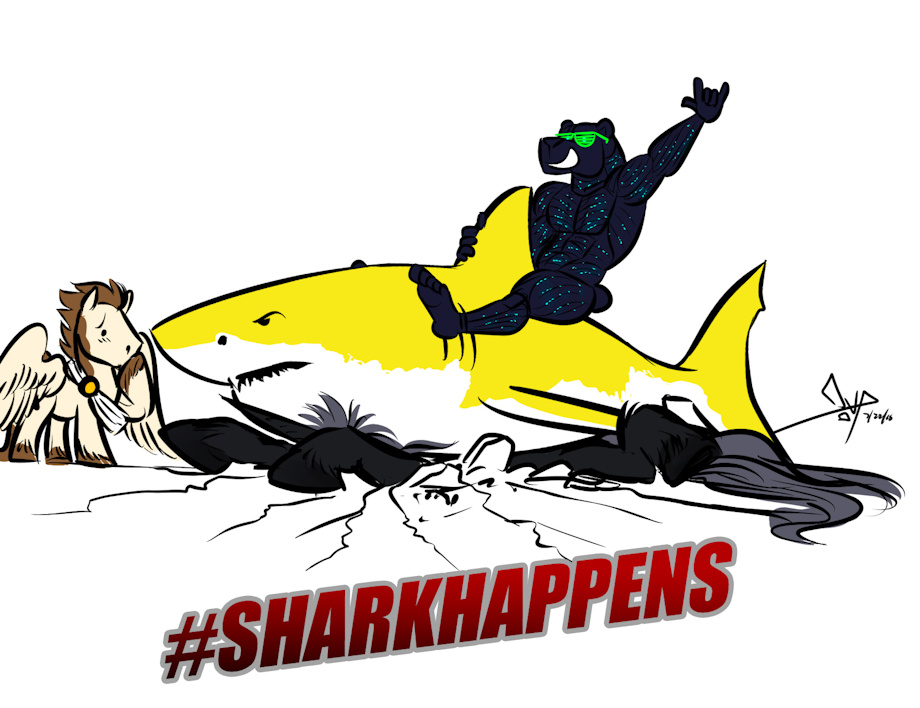 AWWWWW YEAH BITCHES! You had to know sooner or later this would happen when you mess with a shark... you get slammed by one! Apparently Nado had a nasty run in with his weather powers as a tornado carried a shark riding Robobear up into the air to land on him. While this shark happens to be yellow, there is not much resemblance to be had of the devilishly handsome lifeguard we all know and love...