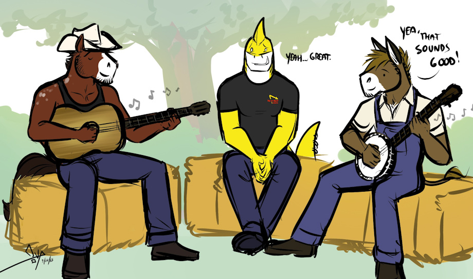 Ryman seemed to be into the rhythm of his song (making the fish wonder if the horse was able to hear his tunes), all in the while Haw was letting the banjo go to town with every strum on the instrument. ""Yeah... that sounds good!" The donkey seemed to bray out, idly tapping his foot as the shark endured the torture that was "country music."