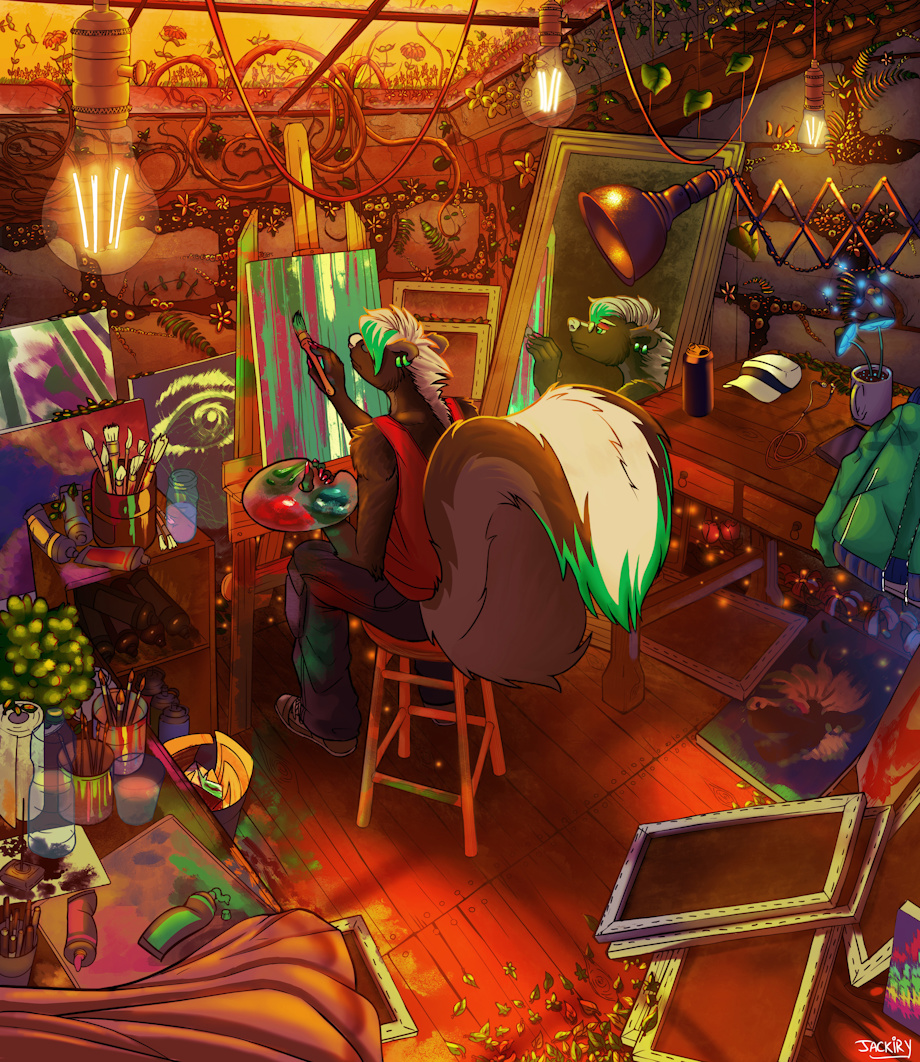 Yet another fan art featuring one of Lapfox trax/HALLEY LABS aliases, Darius! I felt strongly about one of his songs called "I'd Like to Paint, Too" for a while, so there he is, finally painting stuff \o/ Very glad how it turned out. Hope you all like it!