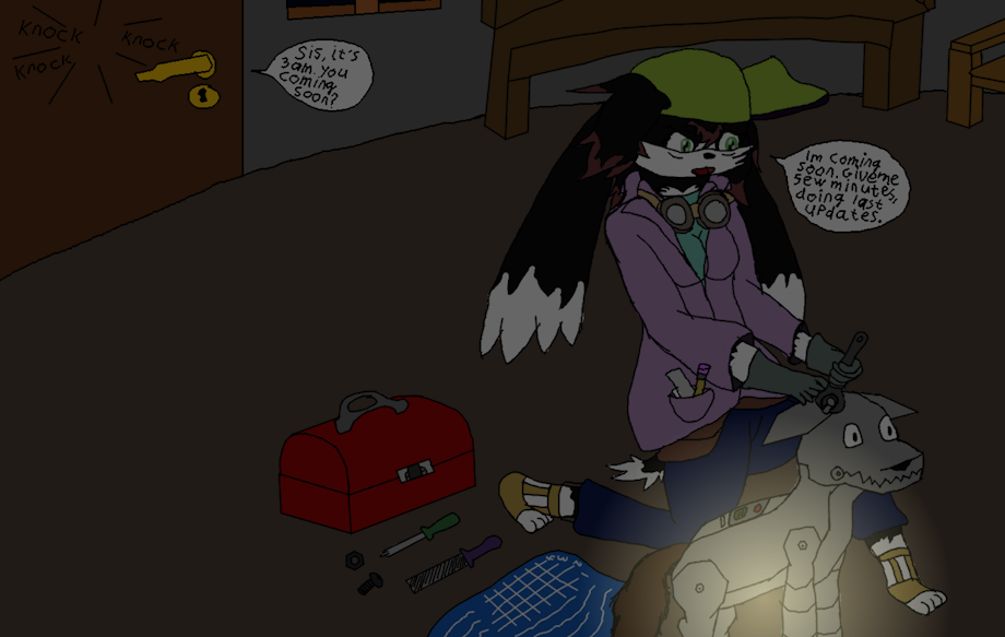i guess Klein wasn't enough for me. so i decided to create a sister for him. Kleins sister is called Shira, she is a inventor and mechanic. she builds all kinds of things like robots or machinery and fixes all kinds of machines. a small mechanic eent is oncoming and she has been building a robot dog with her brother Klein, but it seems her work has gone way too late on the time. she is still working on the dog they built together and Klein telling her the time and when she will be coming to sleep. all she says is in few minutes cause of small updates and Klein acknowledges it and tells also that her night breakfast is still waiting for her. after a while of updating she finally headed to bed to sleep.