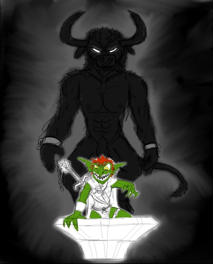 Hehe, while looking for something to draw, I flipped passed some of my goblin sketches, and combine that with a dash of minotaur, sort of inspired by "Your Highness"... I couldn't resist! Just meant to be a quick sketch to keep up that "draw every day" thing. I would have kept going, but I really need to start going to bed earlier, so I'll finish it later... and maybe throw in one or two more pics of this little goblin's hijinks! >=3