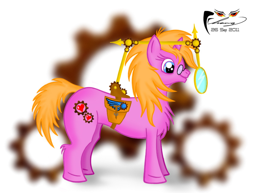 Meet Abney pony, a strange little gal obsessed with Steampunk, so much that she invents different gadgets to help her out with every day chores. Here she is sporting her magnifying glass and accessory bag. Her cutie mark, gears with hearts, of course signifies her love with all things Steampunk.