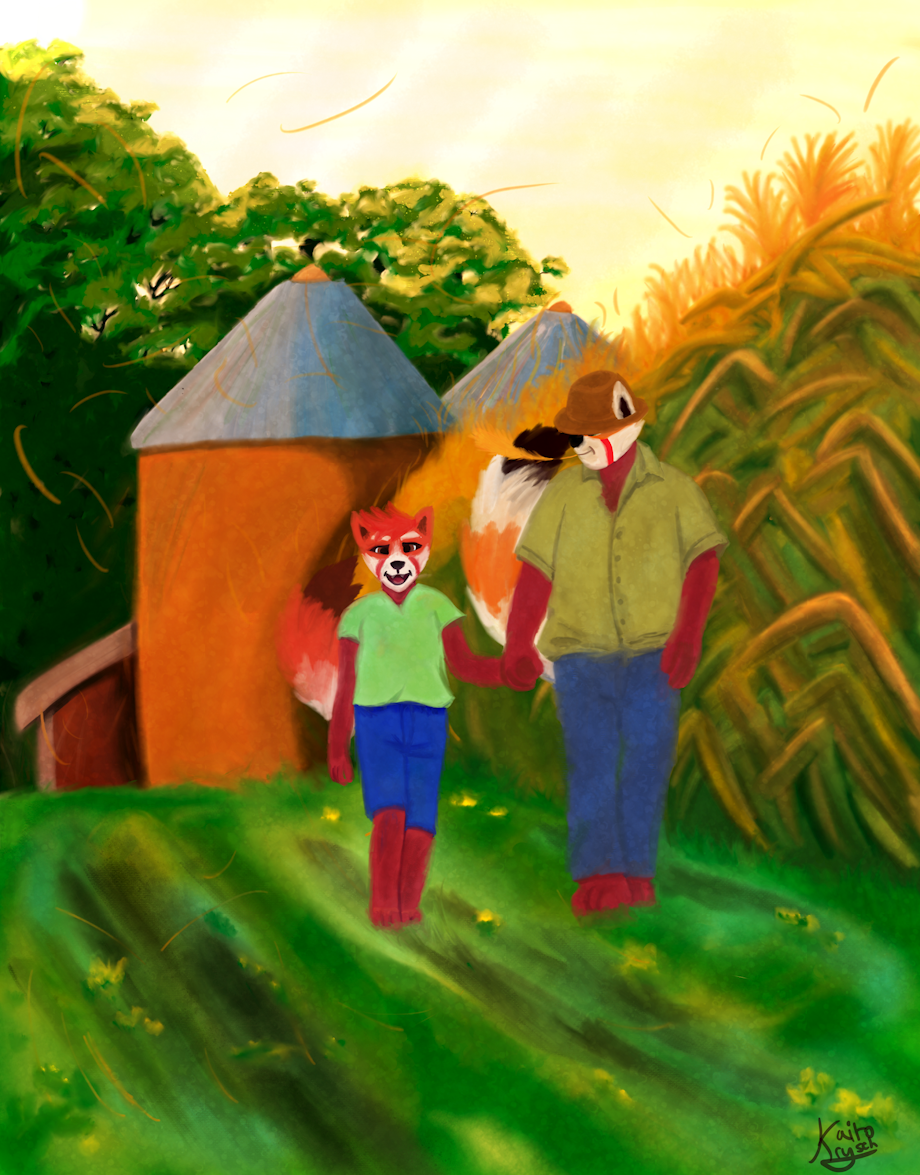 Here is my character Kaito and his son Kaiden as two farmers taking a stroll in the sun past a field of corn.