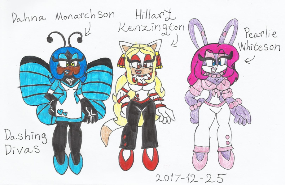 Here are the Dashing Divas. They are snobby, vain, rich and kinda mean and spoiled but they are not evil. Hillary Kenzington the Cat is the leader along with her friends Dahna Monarchson the Butterfly and Pearlie Whiteson the Rabbit.