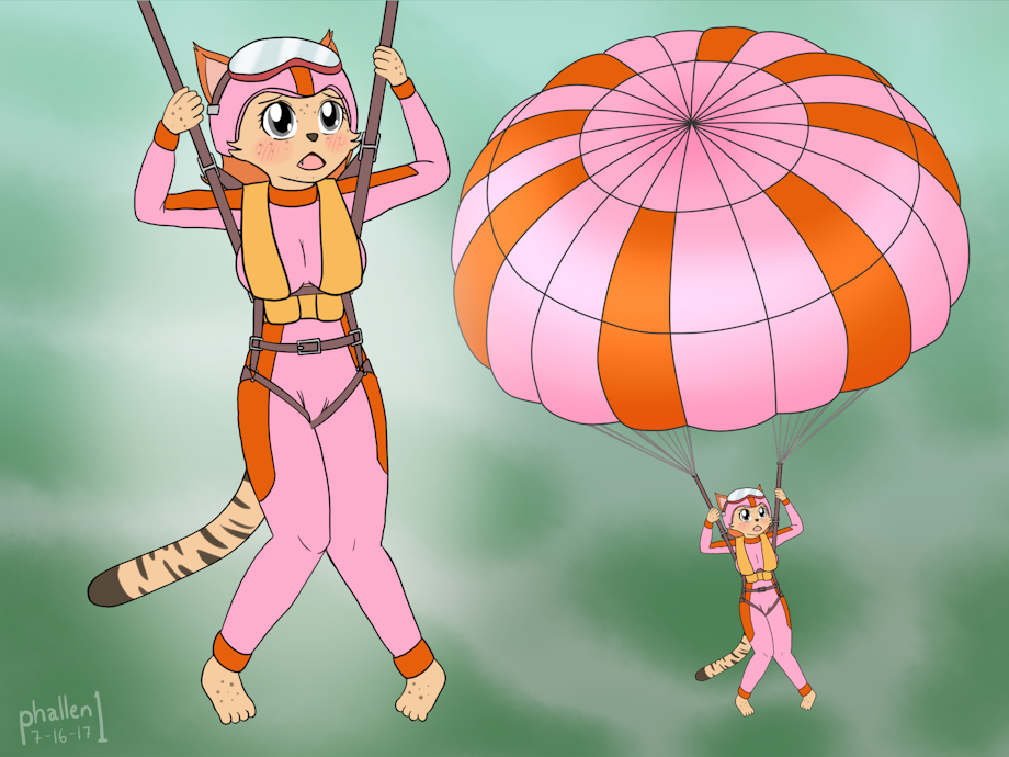 Savvie the catgirl, skydiver and student pilot, riding through the sky on a "softie" style aviator's parachute. These parachutes are worn with the pack under your butt, acting as a seat cushion until you need it to save your life.