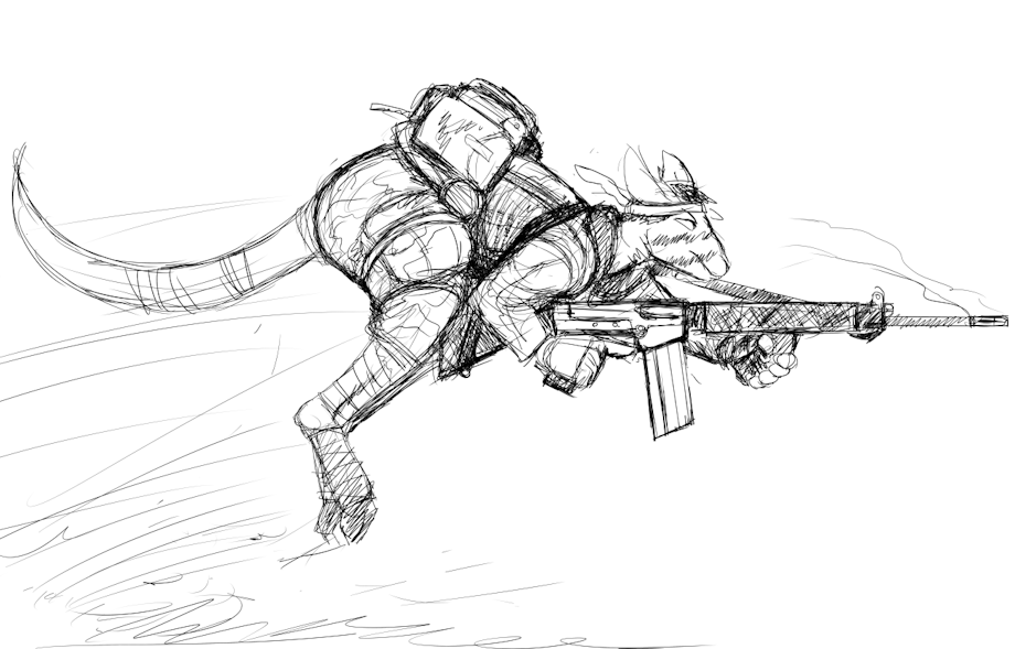 I got a laugh when I saw someone comment about these drawings and they mentioned that the characters had unhappy expressions.  Apparently the complaining folks haven't had to hump stuff like a MK19, 50 cal, full 60mm mortar and rounds, or a radio with a pack full of batteries.  When I saw the MK19's on folks backs, I even said WTF!!!  :)