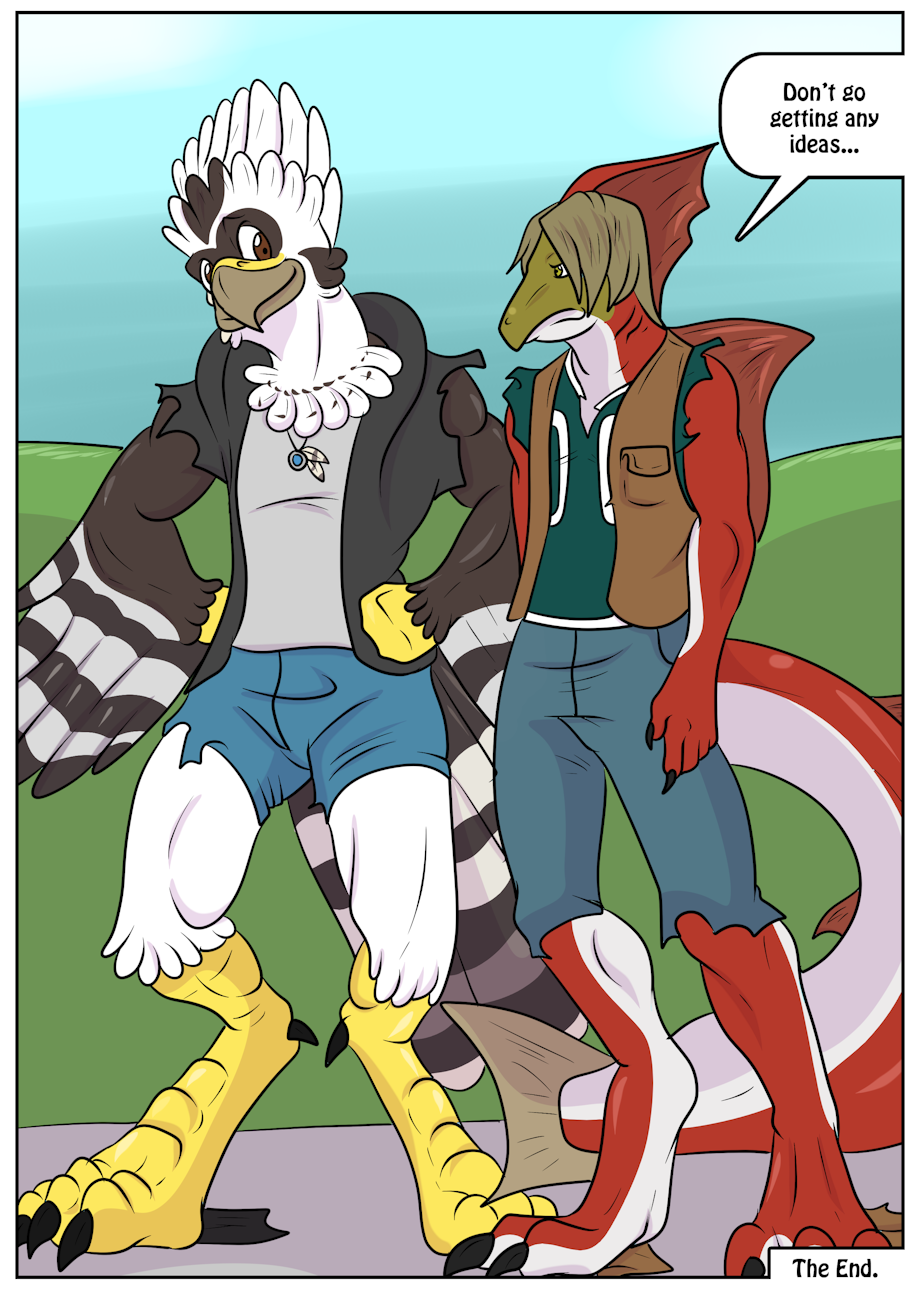His lower body was next, a feathered tail bursting from his pants and feathered legs destroying the rest.