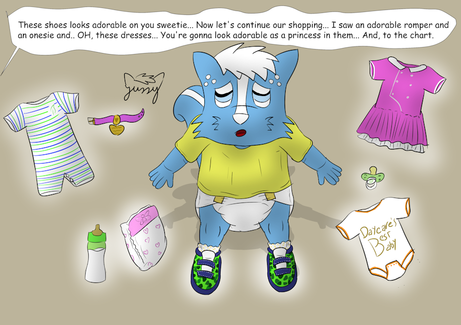 It looks Gussy is under a babysitter's charge, who loves shopping... When she promised some brand new clothing for him, he should had expected it... Who could tell there's a bunch of stores that sell babysh items for big kids...