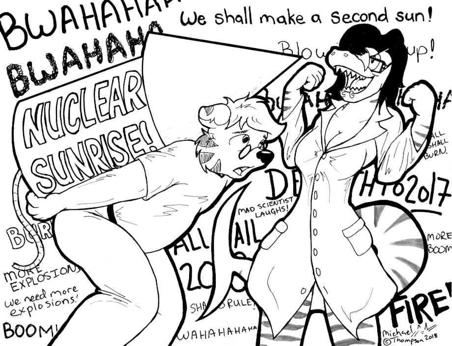I took this and went one more step beyond her idea and decided to draw our lovely sharky as a mad scientist for some reason... But now she gets to blow this shit up!
