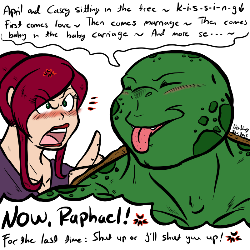 Because 2003 April is definitely like a little sister to 2014 Raphael / turtles How Raphael knows about Casey? April has have some days when she has been missing other turtles and Casey and in those moments she has told about them to Raphael. After this Raphael has start to tease April about Casey with this little jingle which, of course, has piss and embarrass April but secretly also lift her mood up :3