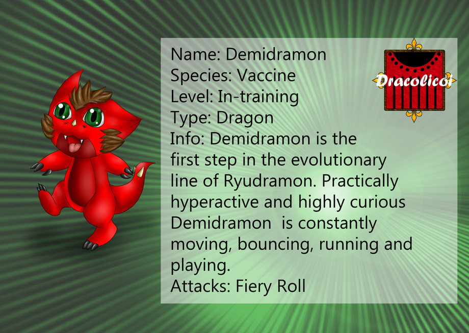 And now, to describe his attack! Fiery Roll is a Digimon version of Flame Wheel of practically any fire Pokemon, he spins into a ball of fire and tackles the enemy.