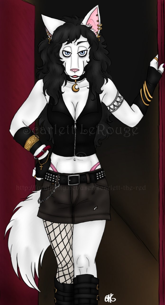 I lack a lot of art of my other characters, but thankfully I have at least a few like this one of Jessie's step-sister Aria. Like Jessie, Aria has a taste for rock 'n' roll and heavy metal, so it's not uncommon for her to dress up in something resembling a biker outfit when going out to a club/bar, fetish club, or rock/metal concert. However, unlike Jessie, Aria is a very dominant minded and strong willed woman and is more likely to put someone else in bondage than find herself tied up.