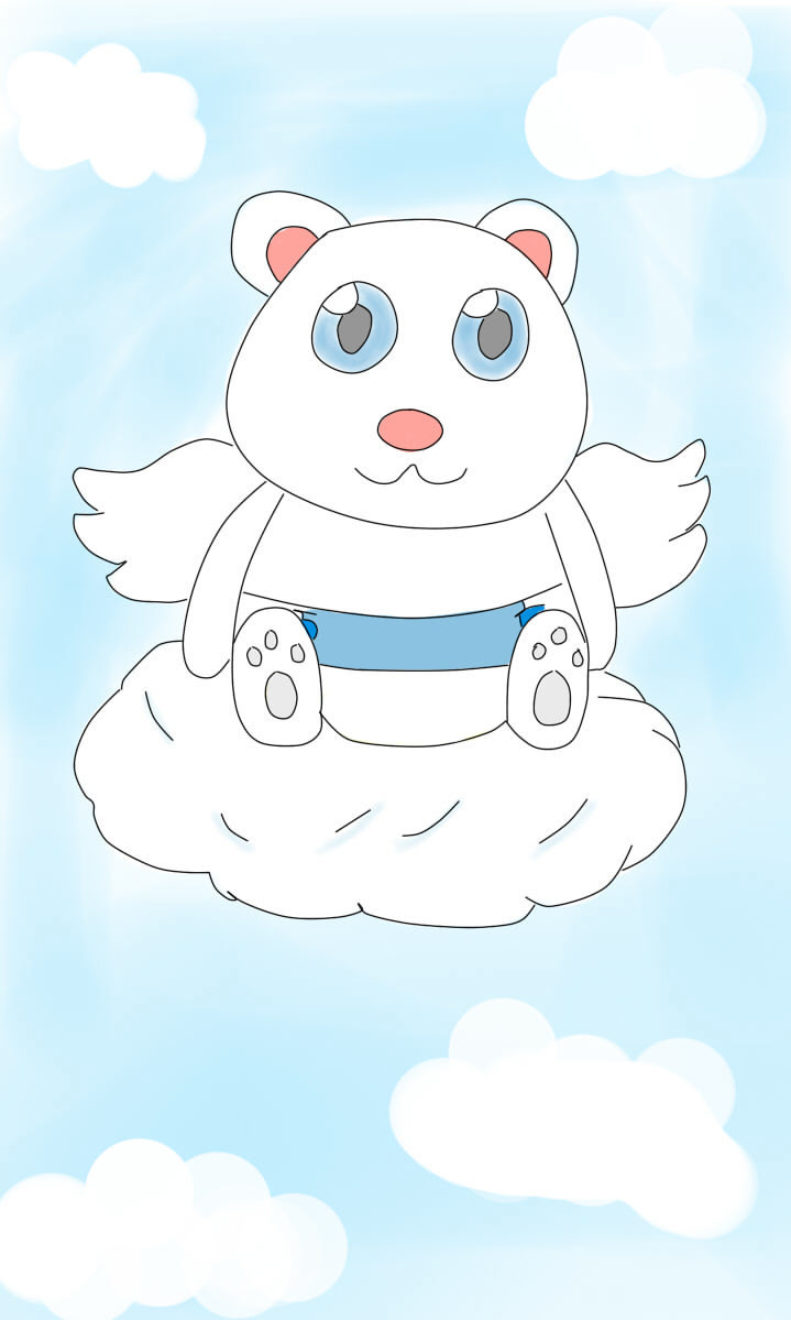 the little angelic bear, angelucky is sitting in the cloud thinking about what to do today, but he does not decide what to do, so I know that he stays there all day, and gets wet for being there all day