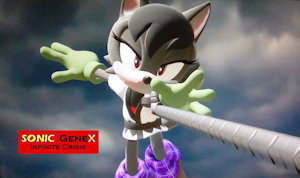 "You!" Infinite was about to attack Sonic, but Felicia arrived on the scene, using her grappling hook to startle Infinite and land beside Sonic. "My friends got me this far, and together we're gonna win!" Sonic declared. "Whether we met before all this or not, Infinite, you're going down!" Felicia added. Thus began a tense battle. Sonic's homing attacks and Felicia's Wispon, equipped with asteroid powers, battled Infinite's virtual energy fiercely. In the end, they teamed up for a double boost, and knocked the jackal down. Infinite himself seemed to be fading as he tried to stand. "Impossible. I cannot be defeated!" he growled. Sonic wagged his finger at him. "Wrong, loser! The things that can't be defeated are heart, soul and the bonds of friendship, three things you and your counterfeit cronies lack!" he declared. Infinite pounded his fist on the ground, and then started fading even more. "No, wait! I can still fight!" he protested before being apparently whisked away to the top of the fortress tower. Sonic and Felicia exchanged confused looks before they heard Eggman's voice overhead. "You never fail to surprise me, Sonic. I didn't believe Infinite could lose." he stated as his Egg Mobile approached them, "Victory will be so much sweeter when I defeat you." he said, an angry look coming over his frustrated face. "Don't think this is over yet, you blue nuisance! My plan just went into overtime!" he declared, flying away from them. "...What does that mean? Doesn't he ever quit?" Felicia sighed. "No, not really..." Sonic muttered, "Come on, partner! Let's finish the job!" he said, giving her a quick fist bump before moving on. They'd have to move fast...if Eggman got the Phantom Ruby out of his base before it could be evacuated, a fiery end might still await the Resistance after all!