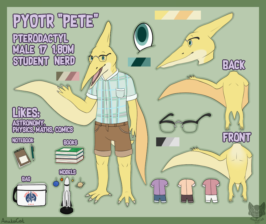 So here's Pyotr. He's a rather shy and nerdy pterosaur. I'm imagining him in a school setting from High-School to College, so he can actually also be older than 17.