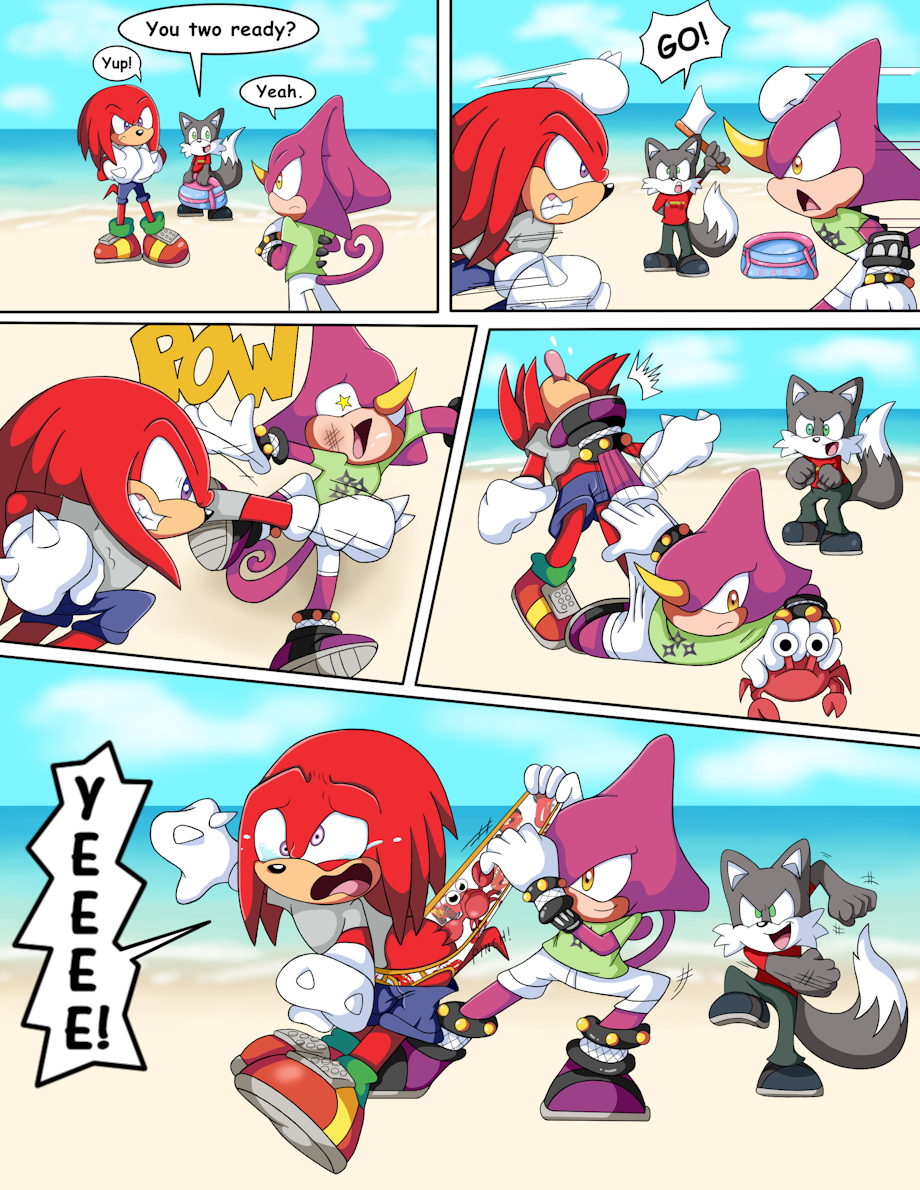 Knuckles the Echidna, Espio the Chameleon, and Sam the Fox have come together on the beach to play out a scenario that these three have wanted to see unfold for a while now; who wins in a fight? The pride of power or the swiftness of stealth? Not necessarily something in a literal sense. Figuratively, these two represent those things but that doesn't mean they aren't going to use each other's specialties in a fight. Knuckles and Espio square off as Sam cheers the fight on in the background with a bag of "supplies" ready for the loser. Who will lose? It will be revealed on page 2. Place your bets and you'll win a free atomic wedgie.