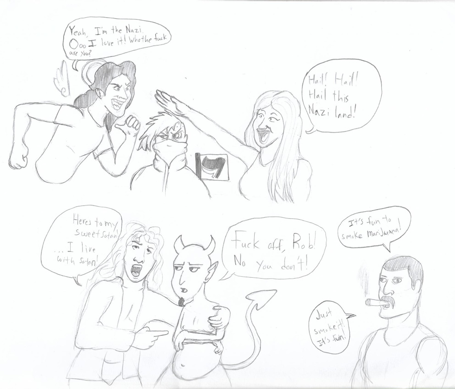 So I was looking through various backmasked messages that were found in music and decided to draw the singers and the supposed message each song is saying but in a humorous light.