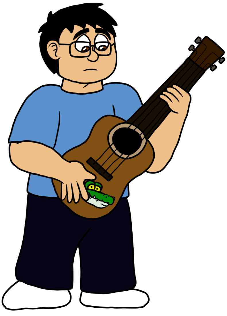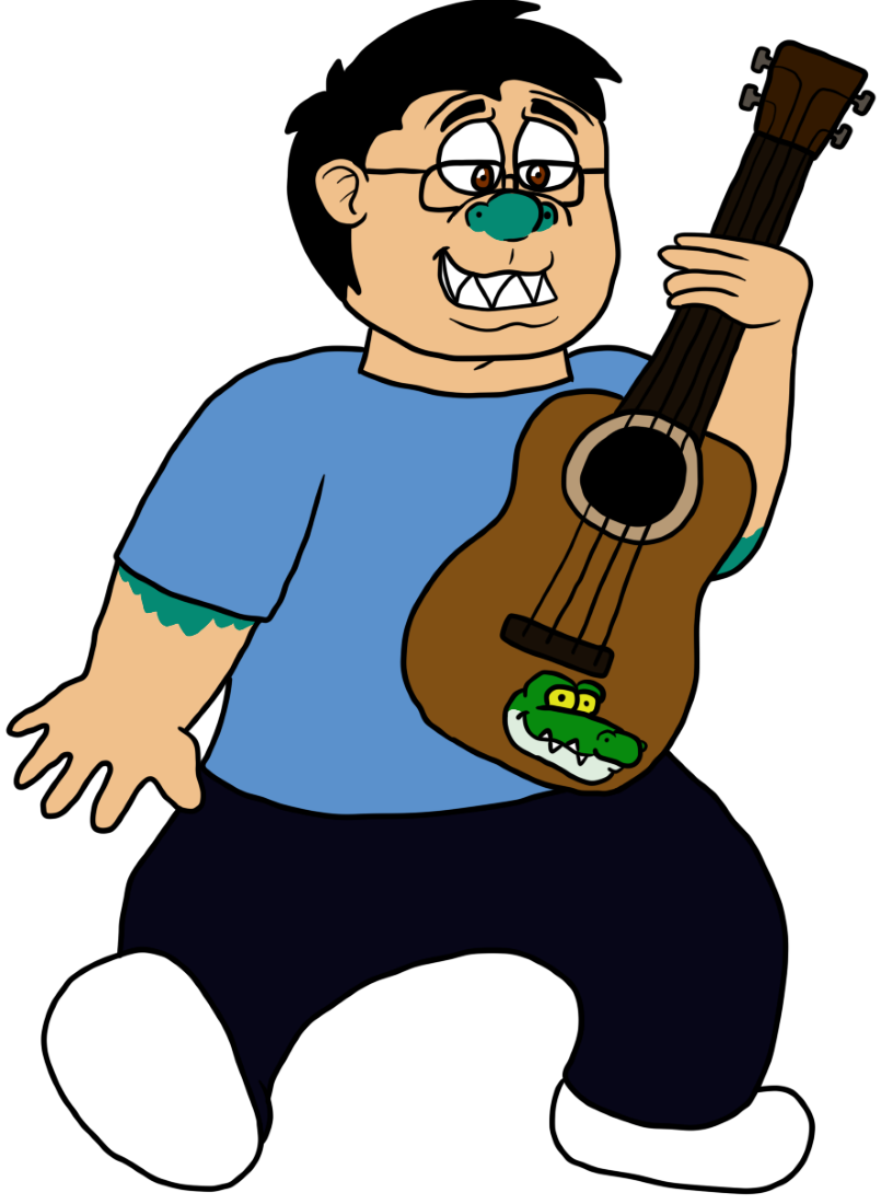 A sequence of me finding a ukelele and playing a tune that transforms me into a fat gator