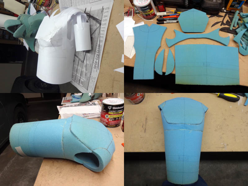 The body has been a problem. After a number of paper prototypes I came up with a design I liked. Not being a natural sculptor, getting the form to look nice with the arms in place is a challenge. I have since found out that this body is to small and narrow for my arm, so I'll have to make a new one to better accommodate the size of the head and provide more clearance for me to angle my wrist downwards. I love the chest, but the shoulders are too droopy and more complex than they need to be. Not shown are the wooden planks in the shoulders that allow the arms to attach to the body with a knot of cord. If you think the chest is overly detailed, keep in mind this will be covered in fabric and a shirt. With the proper covering in place, it actually looks pretty normal. Like me in real life, Wac has lost a lot of weight recently so he's more buff than he used to be. Body and neck v2.0 will begin after the weekend (I've been really sick this week).