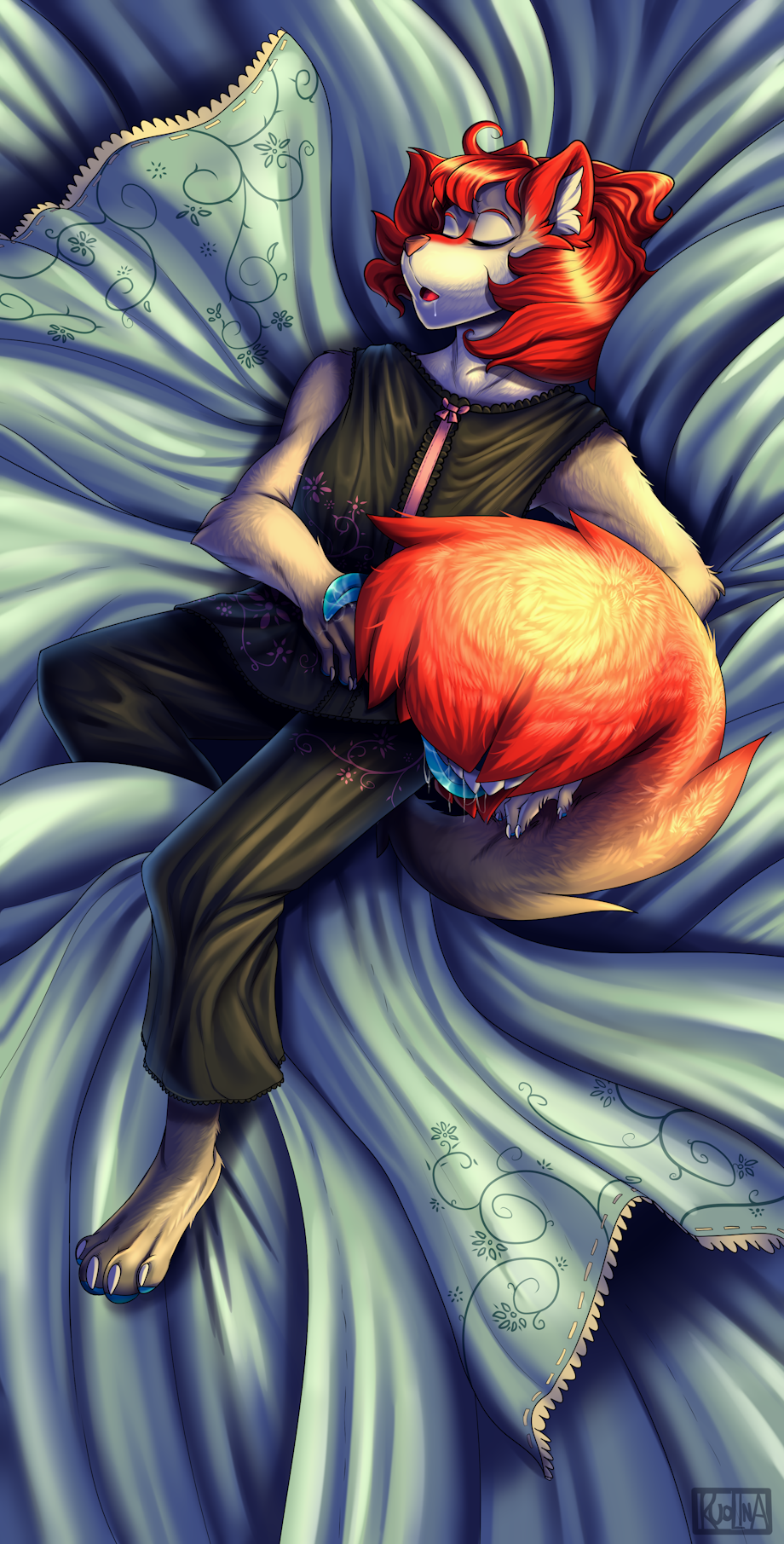 This was an idea I had for a very long time for each of my three ladies. Each dakimakura design would be uniquely different and be specific to the nature and character of the female being represented. For Taylors's pose and concept, I wanted to subvert expectations put on the term used and instead of doing something more risque with her, I went the complete opposite. In her case, I wanted to showcase her sleeping habits and that she was a restless sleeper, constantly moving about and getting the blankets all messed up every night. The goal was to highlight her innocence and make her look cute and adorable while sleeping, complete with Ahya suckling on her thumb and Taylor drooling a bit during her dreams.