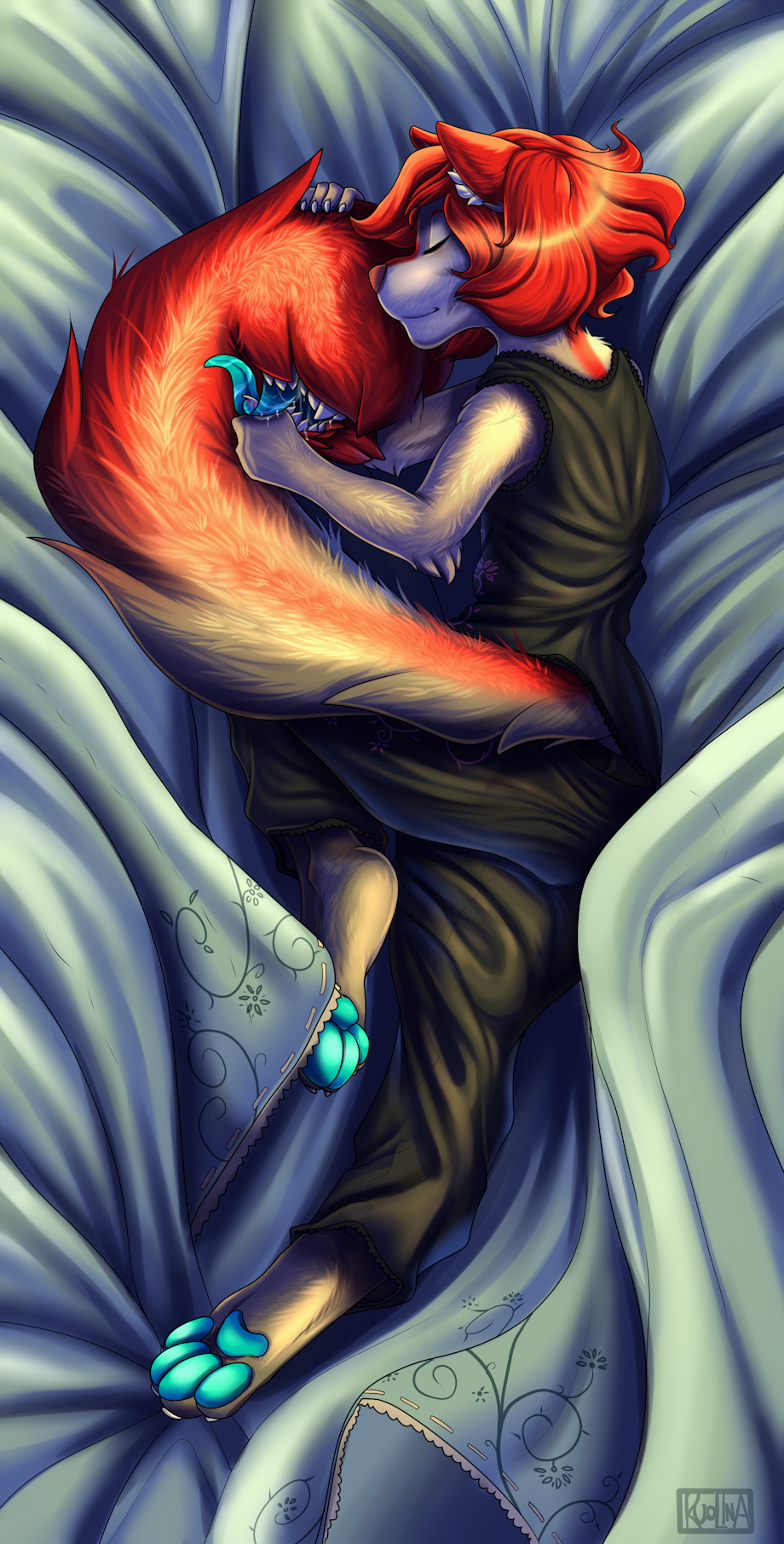 This was an idea I had for a very long time for each of my three ladies. Each dakimakura design would be uniquely different and be specific to the nature and character of the female being represented. For Taylors's pose and concept, I wanted to subvert expectations put on the term used and instead of doing something more risque with her, I went the complete opposite. In her case, I wanted to showcase her sleeping habits and that she was a restless sleeper, constantly moving about and getting the blankets all messed up every night. The goal was to highlight her innocence and make her look cute and adorable while sleeping, complete with Ahya suckling on her thumb and Taylor drooling a bit during her dreams.