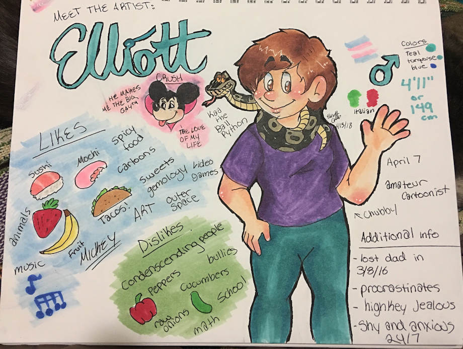 Elliott loves to draw, read, write and take care of animals. He regularly volunteers at community centers and is very involved with non-kill animal shelters. Being very empathetic, he can sense emotion coming off of other people, and it can affect his mood drastically.