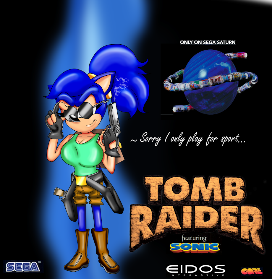 Lara Croft wasn't available so SEGA got their blue mascot to fill in, "it's a amazing what a make up team can do. ;) " for the Mega Hit Saturn game coming this 1996 Christmas... What you were expecting Sonic Adventure? Sonic Team is too busy with Nights. ;) :iconNightsplz: