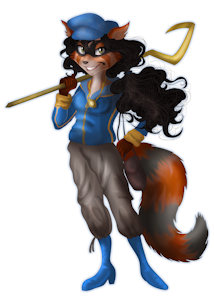 Carmelita immediately retrieved her gun, grabbing the intruder and thrusting them into the light of the window. Her initial belief of the figure being a raccoon was correct, but this one had odd colored fur. Where Sly's fur was your typical grey with black stripes, this raccoon had a reddish tinge to her fur. Her outfit resembled that of Sly's, right down to the navy blue and gold color scheme. The black mask over her eyes and the cap on her head might as well have been Sly's own. The only distinct differences were that she carried a brown satchel rather than a red backpack, and she had long, wavy black hair spilling out from under the cap.