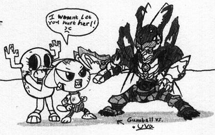 This is just a little scene I did just for the hell of it. It's of Gumball about to protect Penny from Uva (from Kamen-Rider OOO).