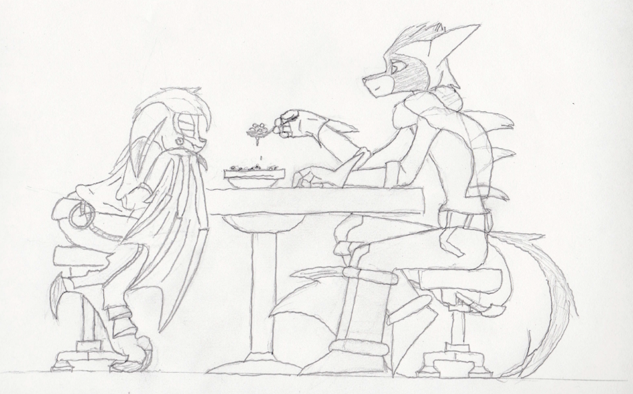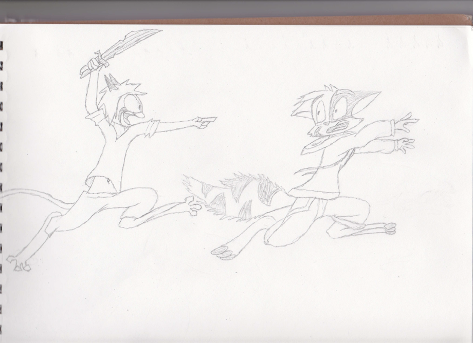 "YAARRGGHH!!! YER BOOTY IS MINE!!" I doodled again! I vaguely remember some time ago that someone asked Dave how Namah would fare if she was an orphan at Grunn's. I believe there was a pirate Namah sketch involved. Thus I give you an enthusiastic Prelude Namah playing pirate with an unwilling Mace. I have a feeling those two would have a lot of fun together if they ever met in Prelude, though I'm sure Namah's antics would eventually prove too much for Mace to handle (like right here). Enjoy! |
