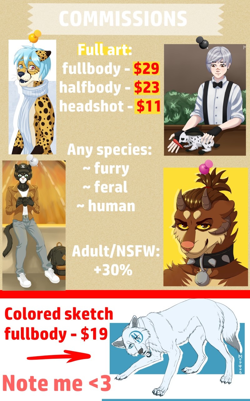 Porn/NSFW +30% Reference — price discuss. Simple background + 8$ Detailed background + 12$+ Plus charachter + full price. Fetish — yes (it will cost a bit expensive). Art by description +30% Wings +$7