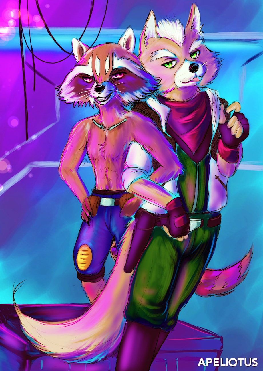 [x] Still playing around with styles, trying to get use to drawing Foxxo here... but whatever, I love doing colored lighting in my art. Tbh I've had a lot of drawings where it nearly pained me to put a top on Rocket because it looked fine without it, but I just went with it this time and let Rocket go shirtless for once.