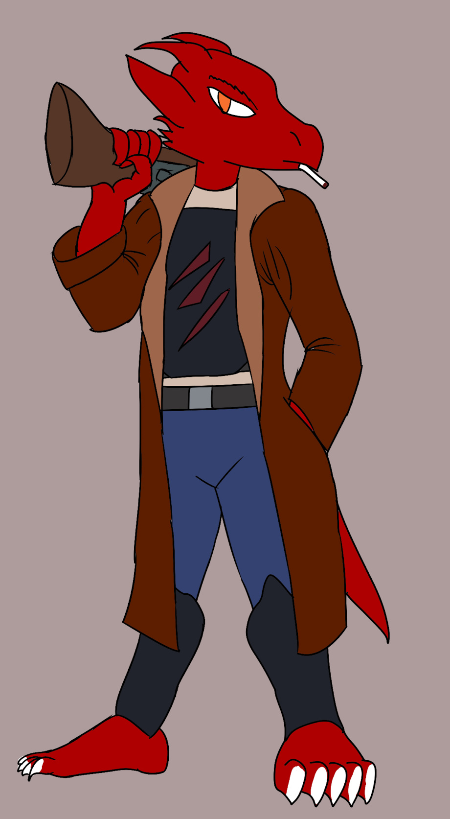 Red scales, with yellow eyes. Although she can control the color of her scales, to the point of chameleon-like stealth.