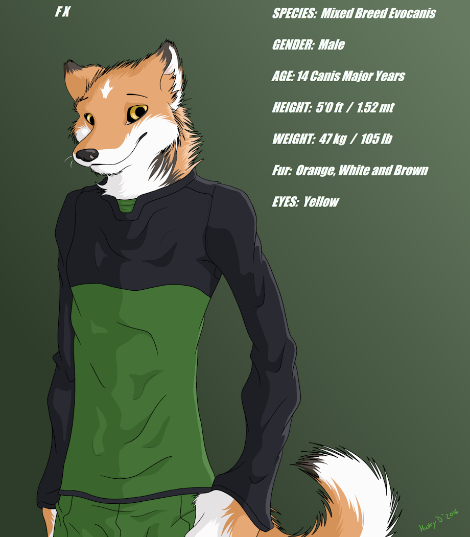 "As many other post-attack Evos, Husky has had a relatively care-free and happy life along with his two only family members; Hasky (his Life Giver) and Fx (his adoptive brother). As short as his life has been, he has had the privilege of enjoying Canis Major's beauty in an age of peace along with his brothers and sisters Evocanis.