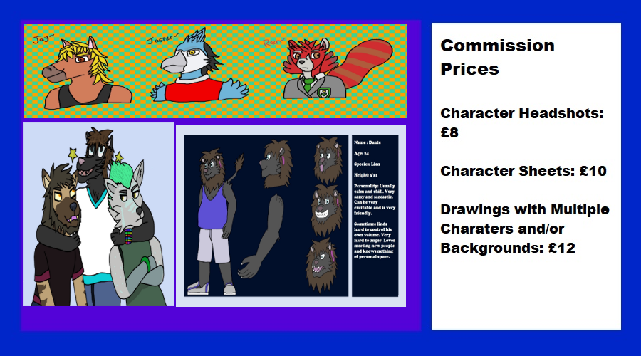Character Drawings with Multiple Characters and Backgrounds: £12 (Can change depending on the complexity of the picture)