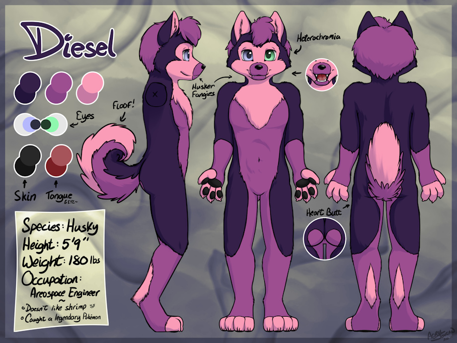 A character reference sheet for Diesel the Husky.