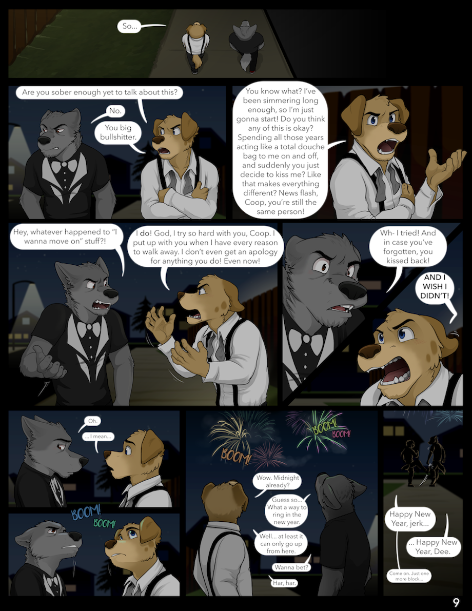 I have to say, of all the gay furry comics I've read, I've never found one like this one. It reminds me a lot of my own love life tbh. I just don't know if I relate more to Cooper or Andy. There needs to be more comics like this. Showing lifelong friends struggle with their feelings for each other. That's another thing I love about this, is it doesn't focus on porn like most comics on here do. It really puts their whole lives and feelings into perspective. Not to mention the artwork is so well drawn. Maybe I'm not looking hard enough, but I can never find amazing comics like this. It's the only one that I am anxiously anticipating what's going to happen next. If I had the money, I'd be pouring it into your patreon so I can see more stories like this.