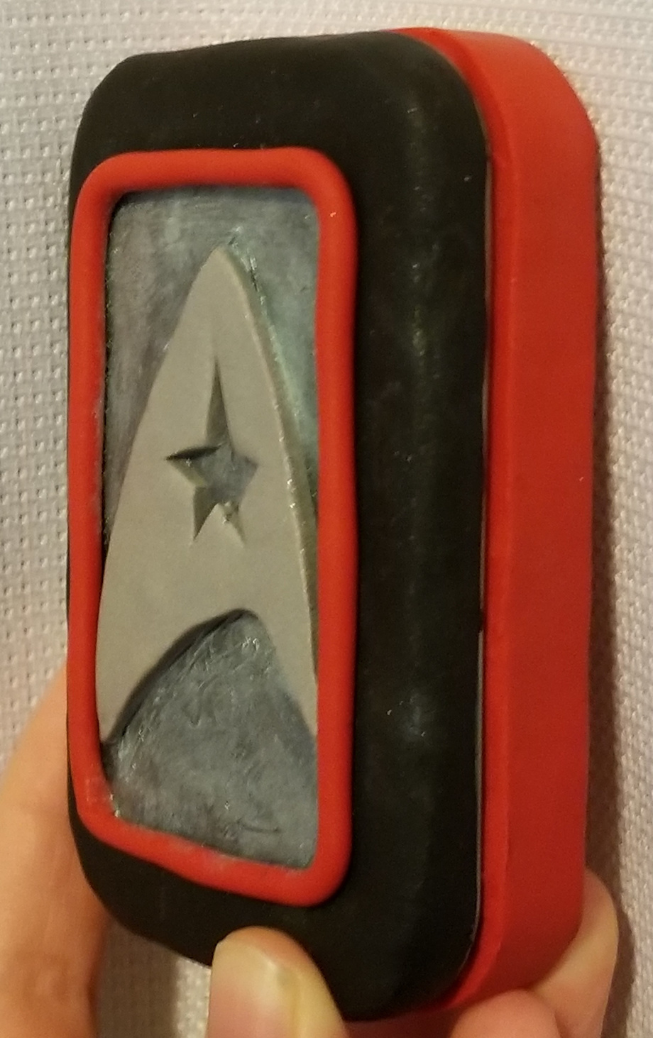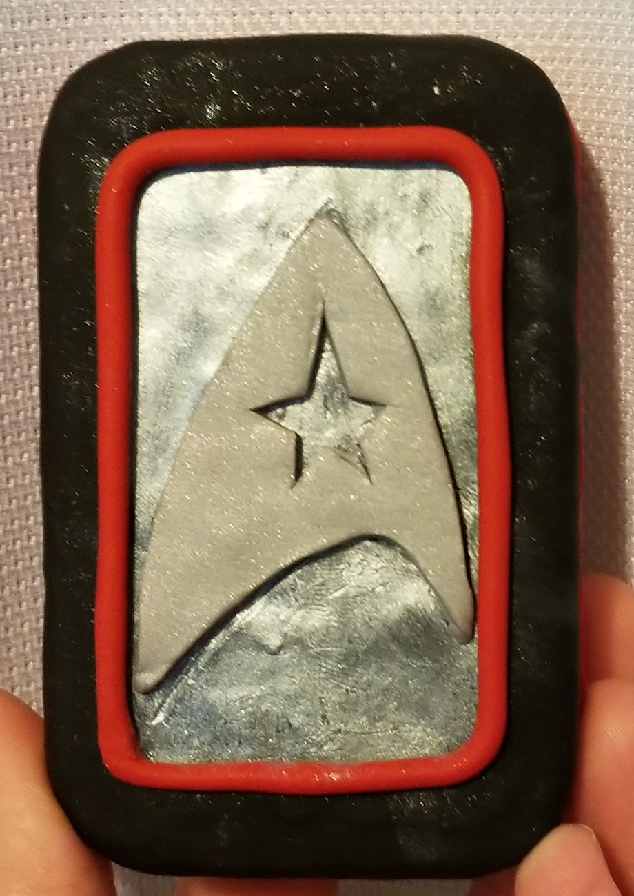 anyways, the badge is from Star Trek original series. The badge it self is the engineering badge that in the show they wear red (You don't want to be red, because you will die). Those that I know that wear red and last more than one episodes are Scotty ("Beam me up Scotty.") and Lt. Uhura.