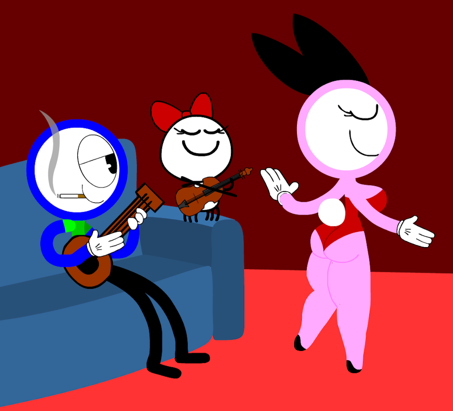 This pic is about Rosy dancing sensually while Bluey plays a guitar and Spidey plays the violin, meaning they're playing a song: