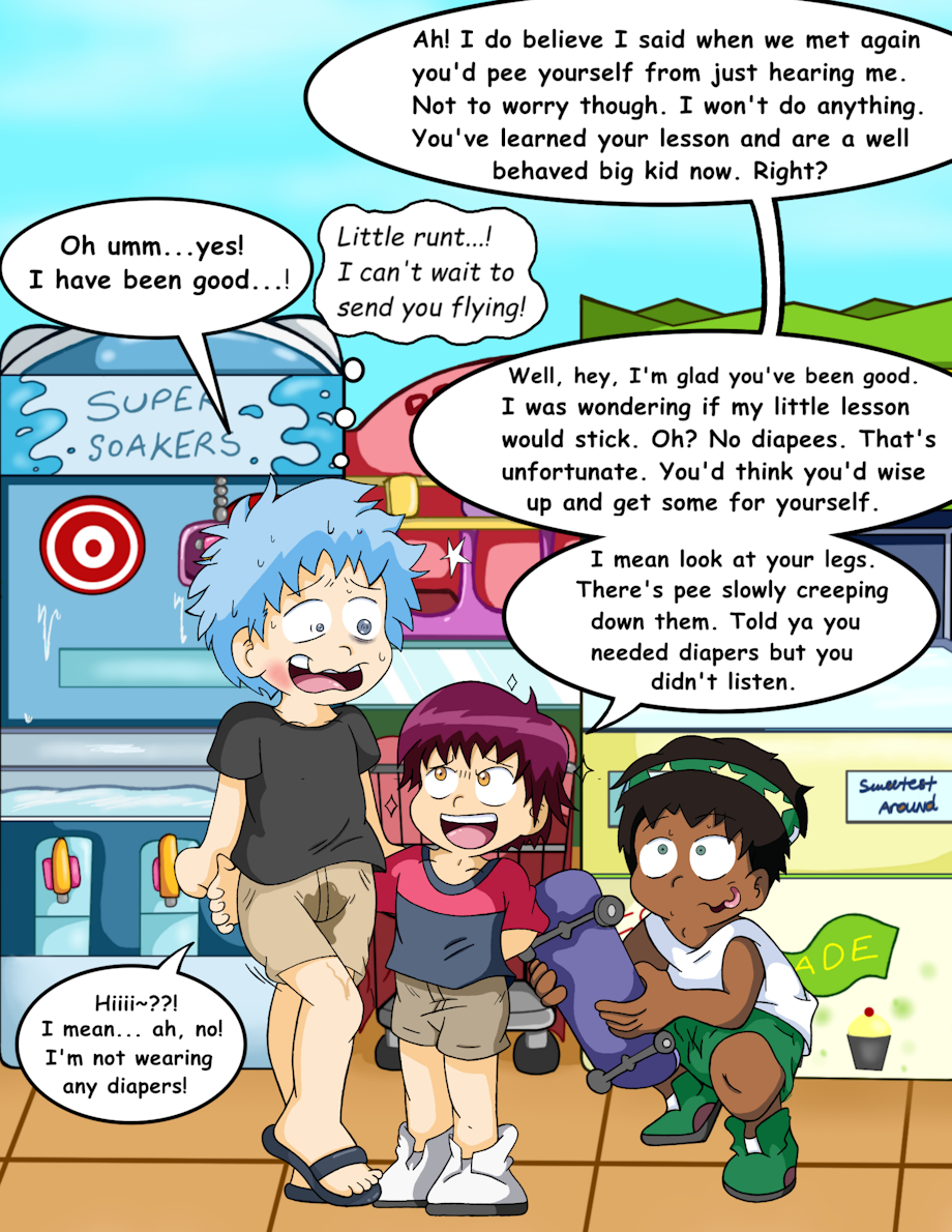 Manzo winced when he heard the hissing sound. He looked down and saw the cascading yellow liquid dripping down Arryn's legs as the new beige shorts he just bought for him got thoroughly soaked in the front. The plan hadn't even started yet and he was already peeing himself? This wasn't right. He didn't even know what to do with the skateboard yet.