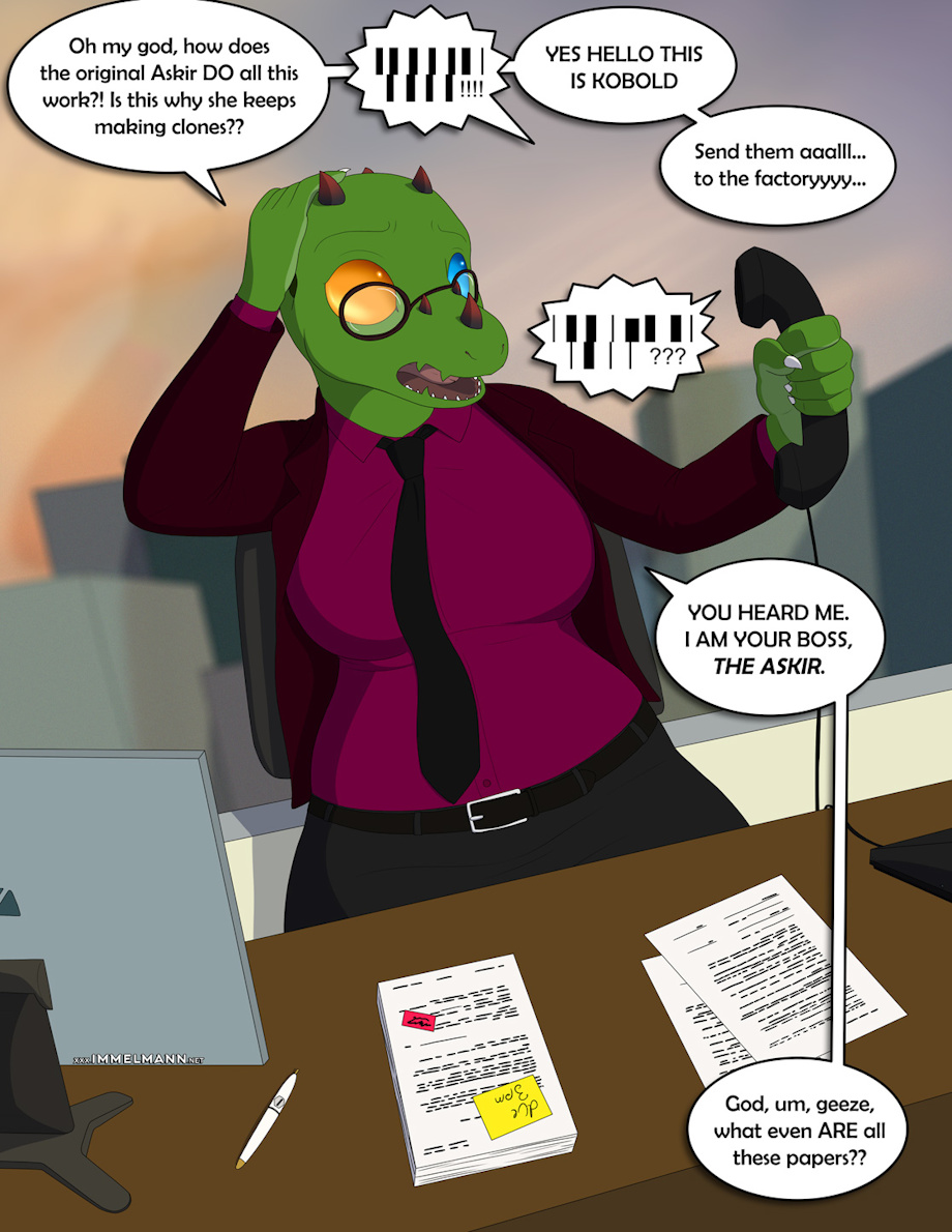 this new Askir now tries to do some of the original's job but quickly finds out she's very much not qualified. Sometimes a clone transformation doesn't come with every required skill!