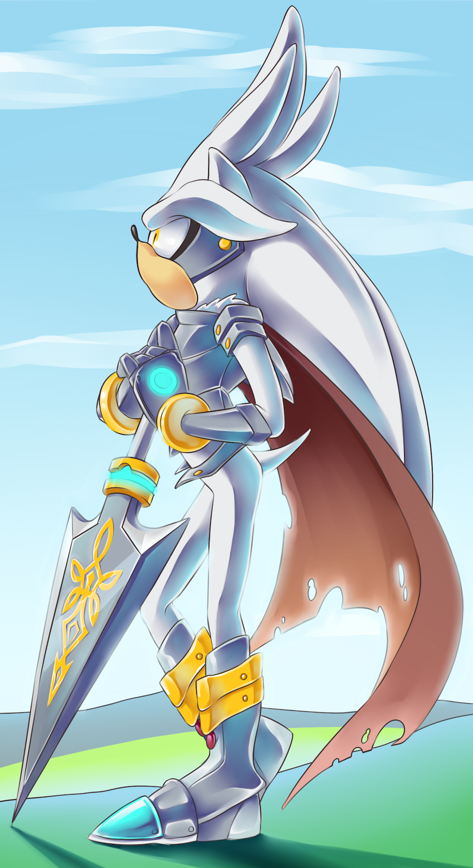 Ooh, nice to see you uploaded this one! I like the way he's resting on his weapon, looking all curious into the distance. Plus bonus for making the markings glow and all the intricate details on the lance and his cape! Silver makes a good shiny knight ^^