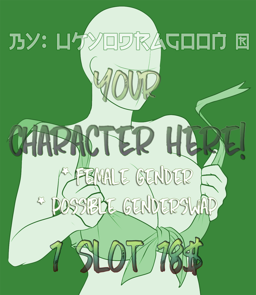 - First paid first served. With this method I know the positions for the YCH drawings - Only serious Autobuy - No refunds and not trades in this YCH - If you take a slot, must send a note for exchange by paypal first. I'll send you other note for verify the payment and then you can send me the references for YCH. If you don't have the references in the moment, you can also make the payment to save the slot and not lose the promotion, so you can send me the reference of your commission later. - You can ask for an OC or fanart - An user can pay 2 slots max. for this promotion.